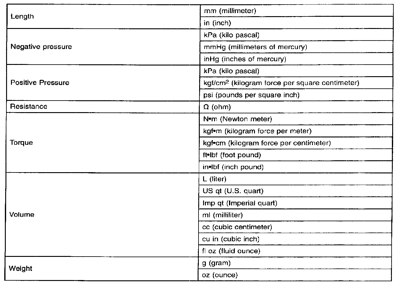 - All numerical values in this manual are used on SI units. Numbers shown in conventional units are converted from these values