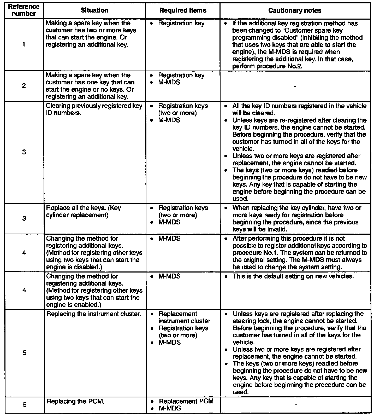 - When performing the following procedures, the immobilizer resetting procedure using the M-MDS must also always be performed: "instrument cluster replacement", "P CM replacement", "instrument cluster and PCM joint replacement", "Key ID number clearing". The engine will not start unless all work is performed using the M-MDS.
