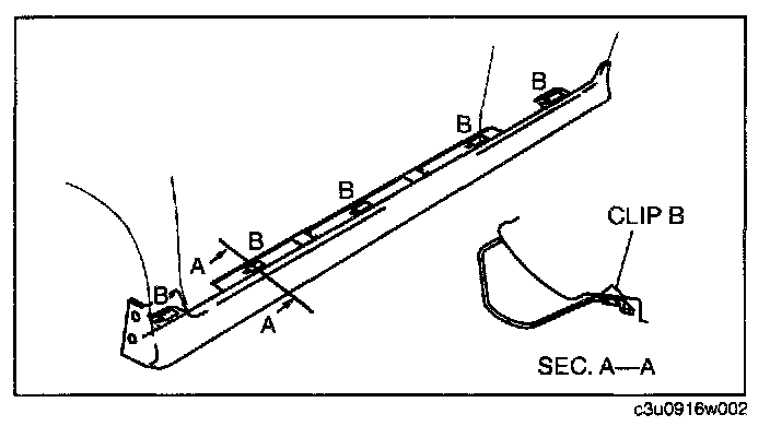 4. Slide the side step molding towards the front of the vehicle and remove clips B from the side step molding.
