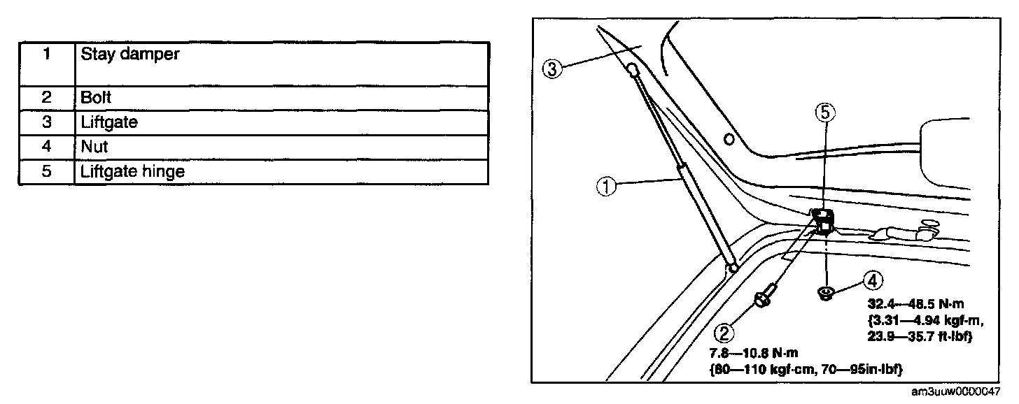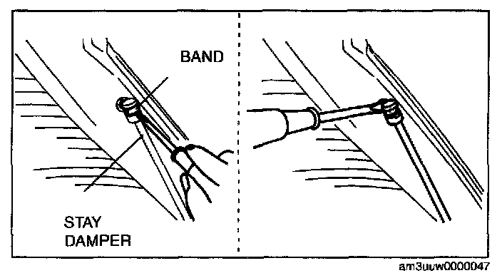 WARNING: Removing the stay damper without supporting the liftgate can be dangerous. The liftgate may fall and injure you. Always perform the following procedure with at least another person.
