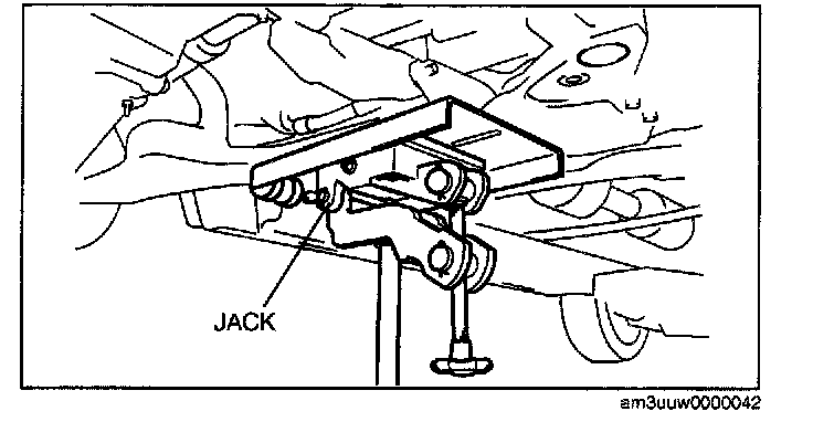 2. Raise the transmission jack gradually and install the front crossmember to the vehicle. At this point verify that the SST is securely inserted in the positioning holes on the body.