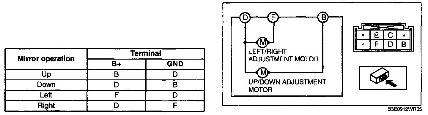 POWER OUTER MIRROR INSPECTION1. Apply battery positive voltage to the power outer mirror terminals and inspect the operation of the power outer mirror.