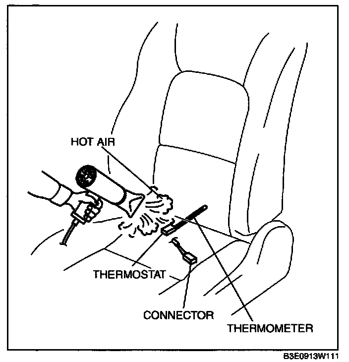 3. While inspecting for continuity between the terminals A and B of the connector, use a dryer to warm the thermostat of the seat warmer unit on seat cushion.