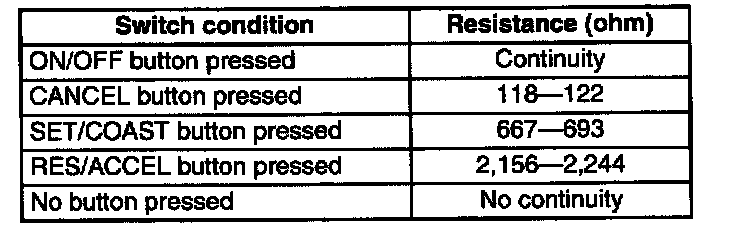 - If not as specified, replace the cruise control switch.