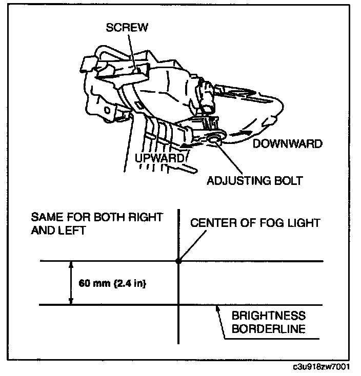 9. Loosen the screw and the adjusting bolt, move the front fog light in the direction of the arrows, and adjust the front fog light beam to the position shown in the figure.