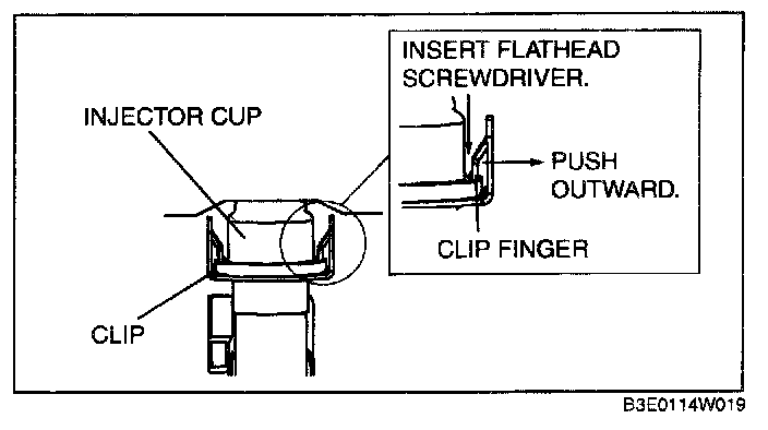 1. Insert a flathead screwdriver between the injector cup and clip finger.