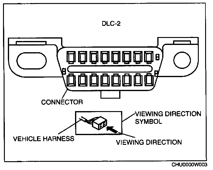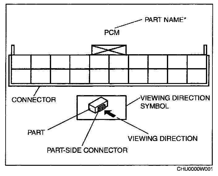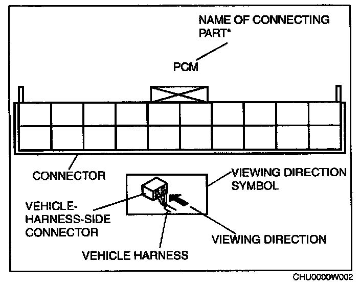 When it is necessary to show the terminal side of vehicle harness-side connectors, such as the following connectors, the viewing direction is from the terminal side.