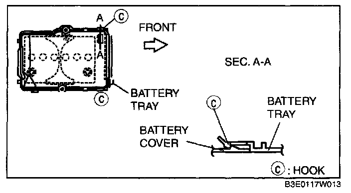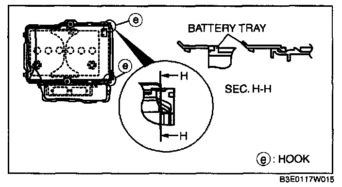 1. Assemble with battery box hooks E aligned with the battery tray holes at two points.