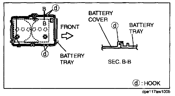 3. Install with battery cover hooks D aligned with the battery tray flange at four points.