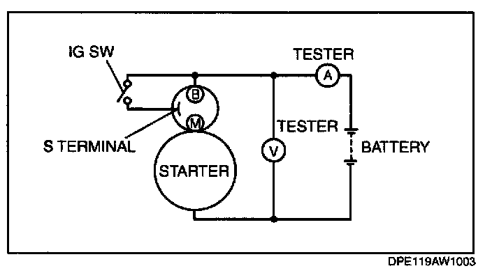2. Connect the starter, battery, and a tester as shown in the figure.
