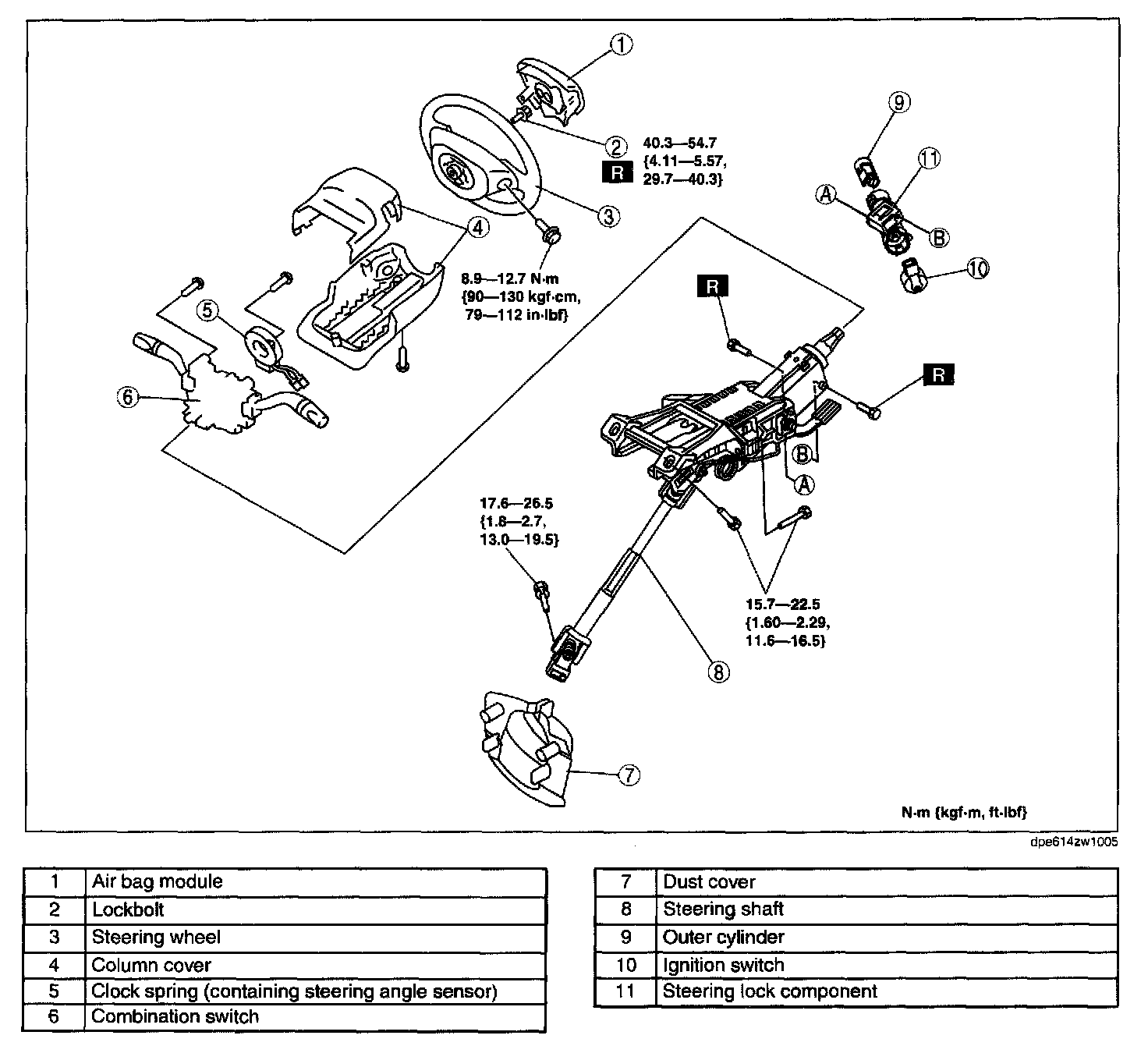 STEERING WHEEL AND COLUMN REMOVAL/INSTALLATIONWarning: Handling the air bag module improperly can accidentally operate (deploy) the air bag module, which may seriously injure you. Read the service warnings before handling the air bag module.