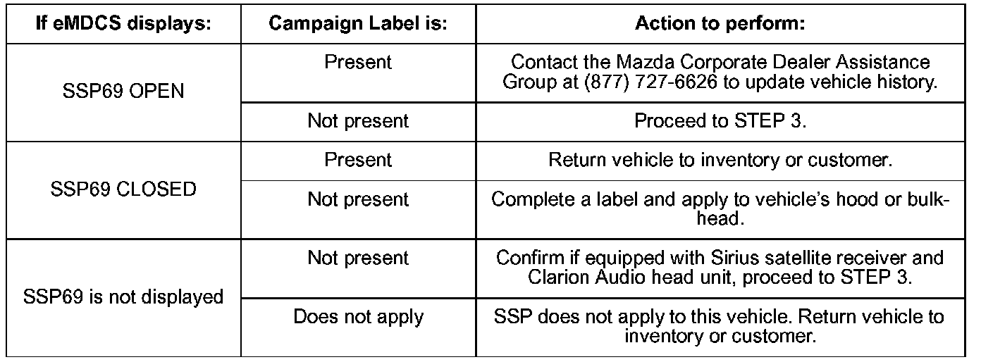 2. Perform a Warranty Vehicle Inquiry using your eMDCS System and inspect vehicle for a Campaign Label SSP69 attached to the vehicle's hood or bulkhead. Refer to eMDCS system - Warranty Vehicle Inquiry. Results table shown.
