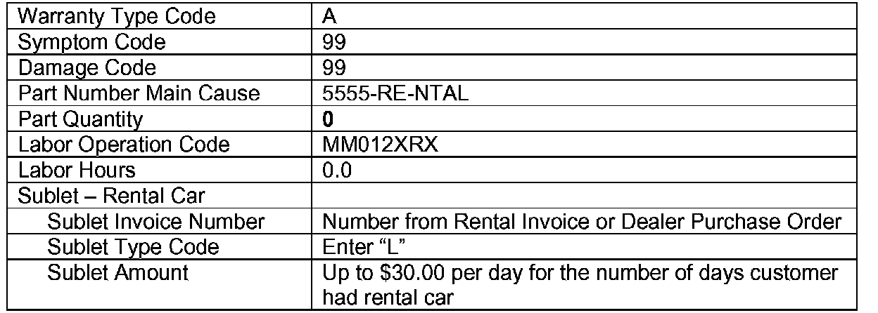 A rental car may be provided to the customer if eligible based on the terms and conditions of the Rental Car Reimbursement Program, policy 12.0. Rental car reimbursements are available only on 2001 and newer vehicles within the mileage and time limitations under the New Vehicle Limited Warranty. If the customer was placed in a rental car while the campaign was being completed, submit a separate claim/problem using the standard rental claim information.