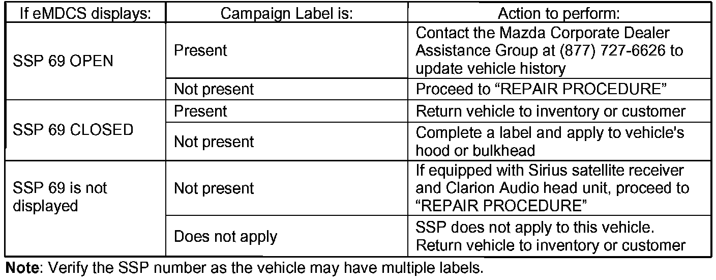 2. Perform a Warranty Vehicle Inquiry using your eMDCS System and inspect vehicle for an Authorized Modification Label SSP 69 attached to the vehicle's bulkhead.