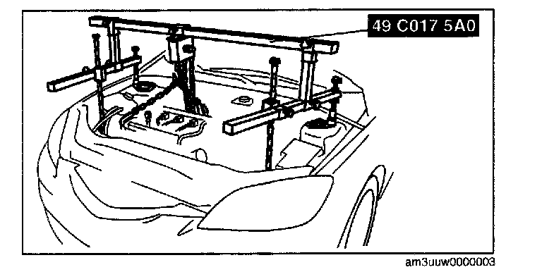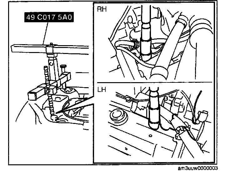 (2) Install the left rear shaft of the SST to the bolt of the left shock absorber (identical position to right side).