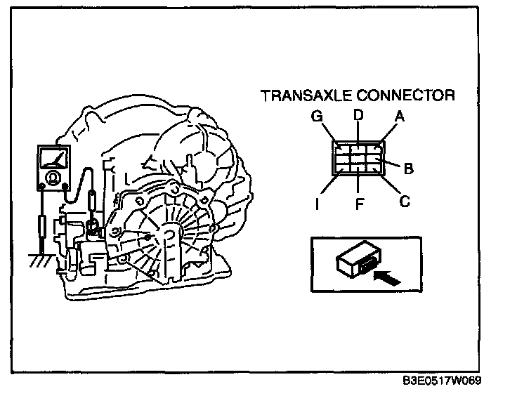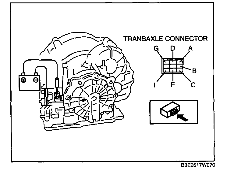 2. Apply battery positive voltage to the transaxle connector terminals A, B, C, F or G and battery negative voltage to GND, and verify that operating sound is heard from the solenoid. If the "click" is not heard, inspect the transaxle harness.