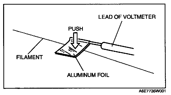 CAUTION: Directly touching the rear window defroster filament with the lead of the tester could damage it. Wrap aluminum foil around the end of the lead and inspect the filament by touching it with the foil.