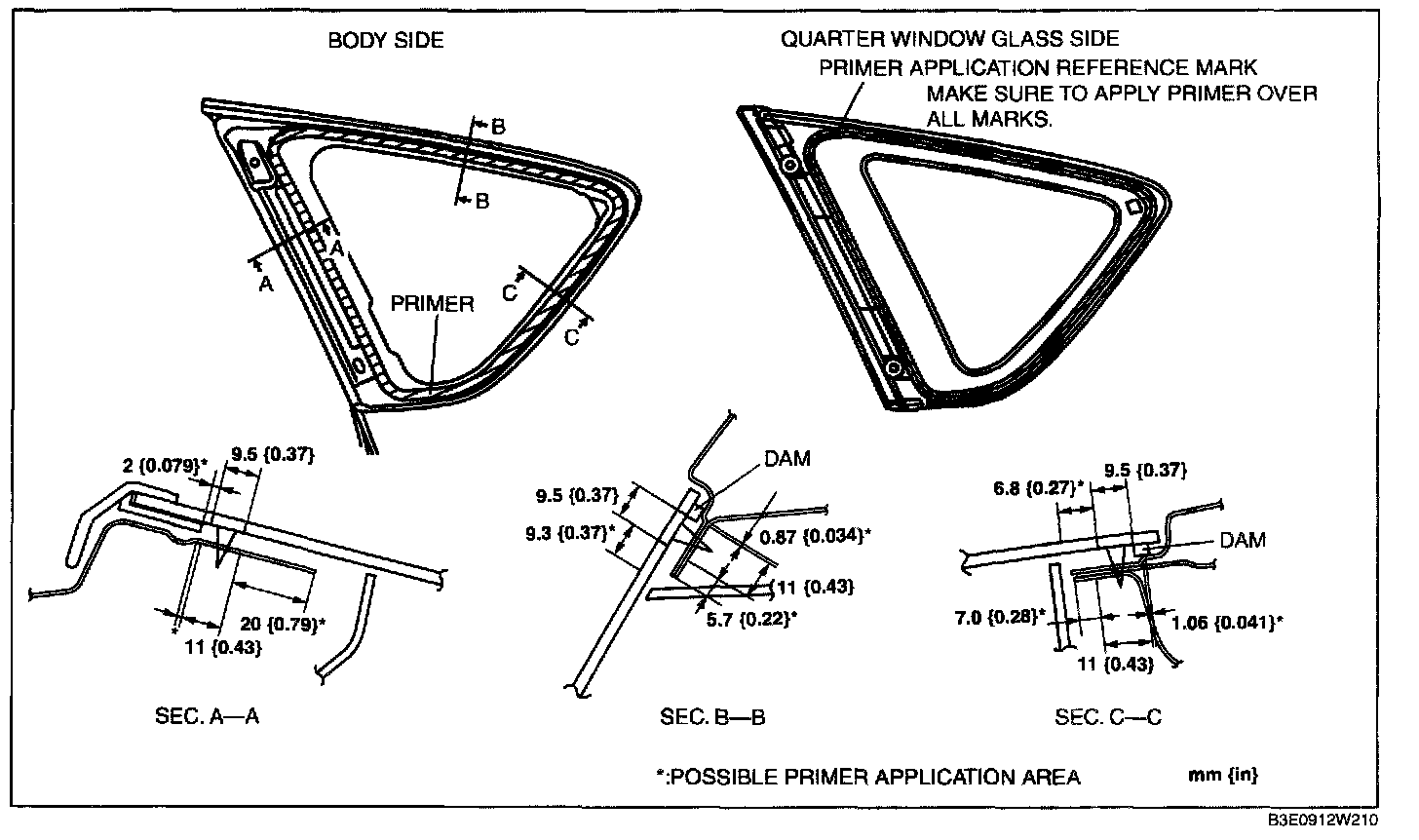 5. Use only glass primer on the quarter window glass, and body primer on the body, then allow it to dry for approx. 30 min.