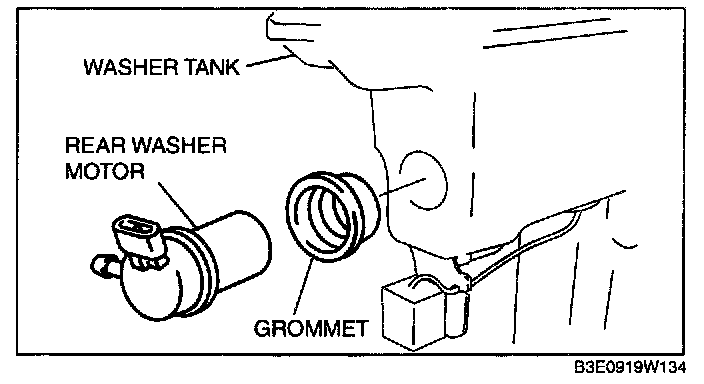 Remove the rear washer motor, then remove the grommet.