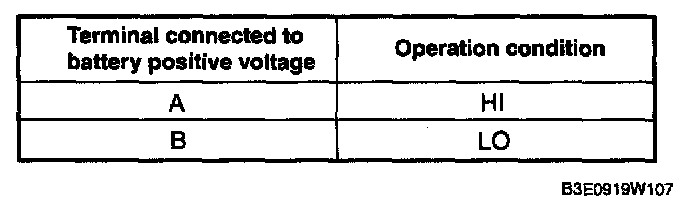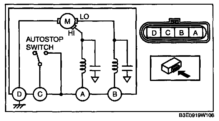 2. Connect battery positive voltage to windshield wiper motor terminal A or B, and ground to terminal D, then verify that the windshield wipers operate as shown in the table.