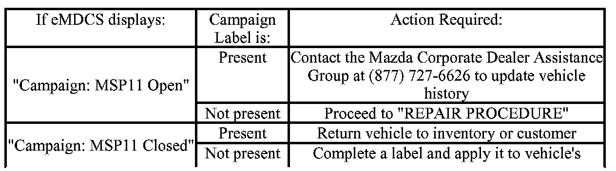 - BEFORE PERFORMING ANY REPAIR, VALIDATE THAT THE VEHICLE IS APPLICABLE TO THIS PROGRAM BY PERFORMING AN "eMDCS WARRANTY VEHICLE INQUIRY" AND VERIFYING THE VEHICLE DISPLAYS CAMPAIGN "MSP11" AND ITS CAMPAIGN STATUS DISPLAYS "OPEN". SEE "VEHICLE INSPECTION PROCEDURE" BELOW.