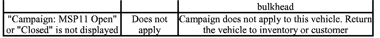 2. Perform a Warranty Vehicle Inquiry using your eMDCS System and inspect the vehicle for a Campaign Label MSP11 attached to the vehicle's bulkhead. Refer to eMDCS System - Warranty Vehicle Inquiry Results table below.