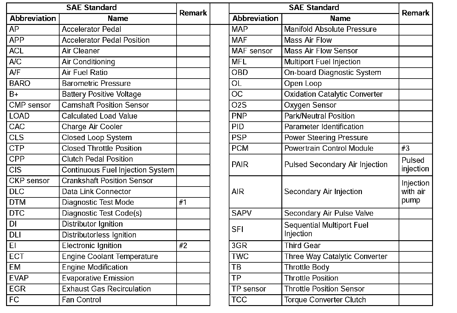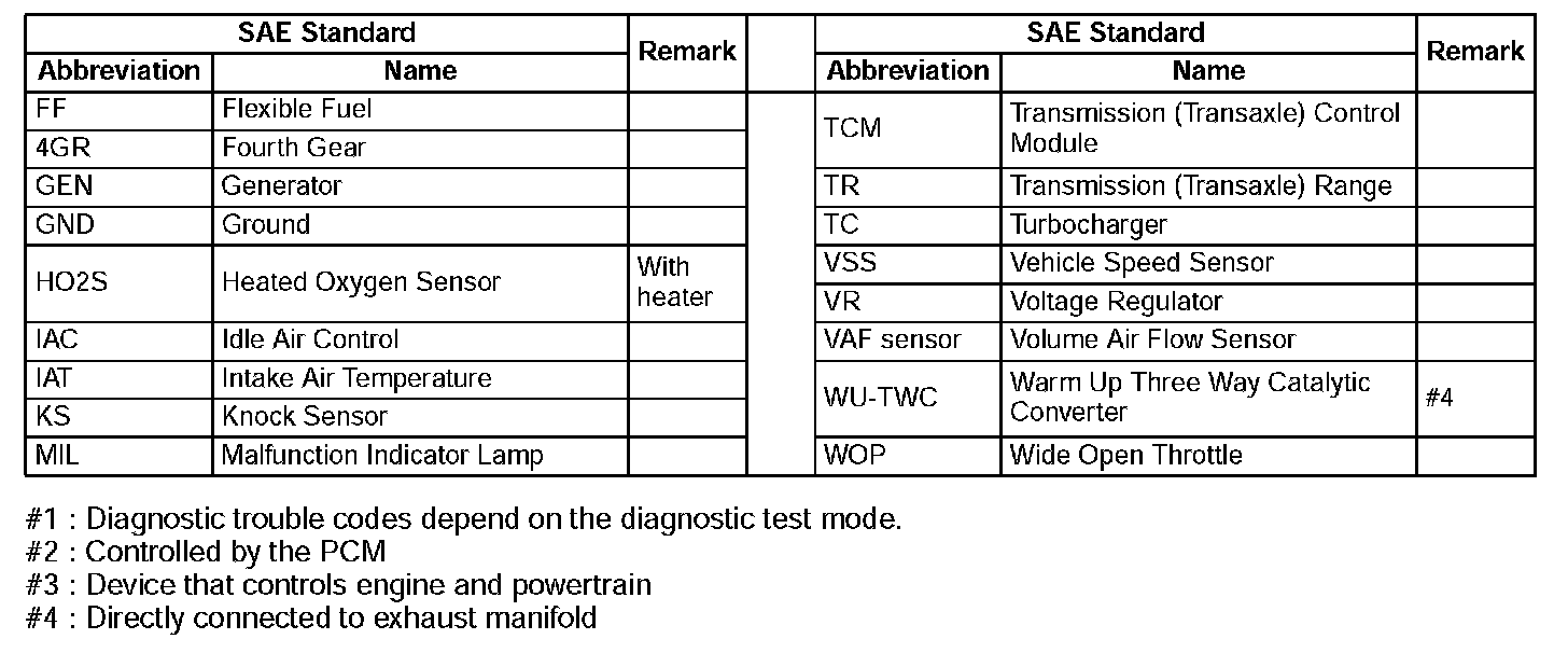 SAE STANDARDS^ In accordance with new regulations, SAE (Society of Automotive Engineers) standard names and abbreviations are now used in this information. The table below lists the names and abbreviations that have been used in Mazda manuals up to now and their SAE equivalents.