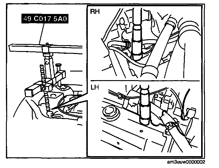 (2) Install the left rear shaft of the SST to the bolt of the left shock absorber (identical position to right side).