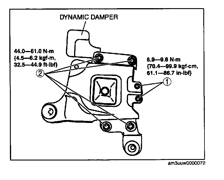 5. Place the dynamic damper over the battery tray bracket with the body stud bolts passing through the holes, then tighten the bolts and nuts in the order shown in the figure.