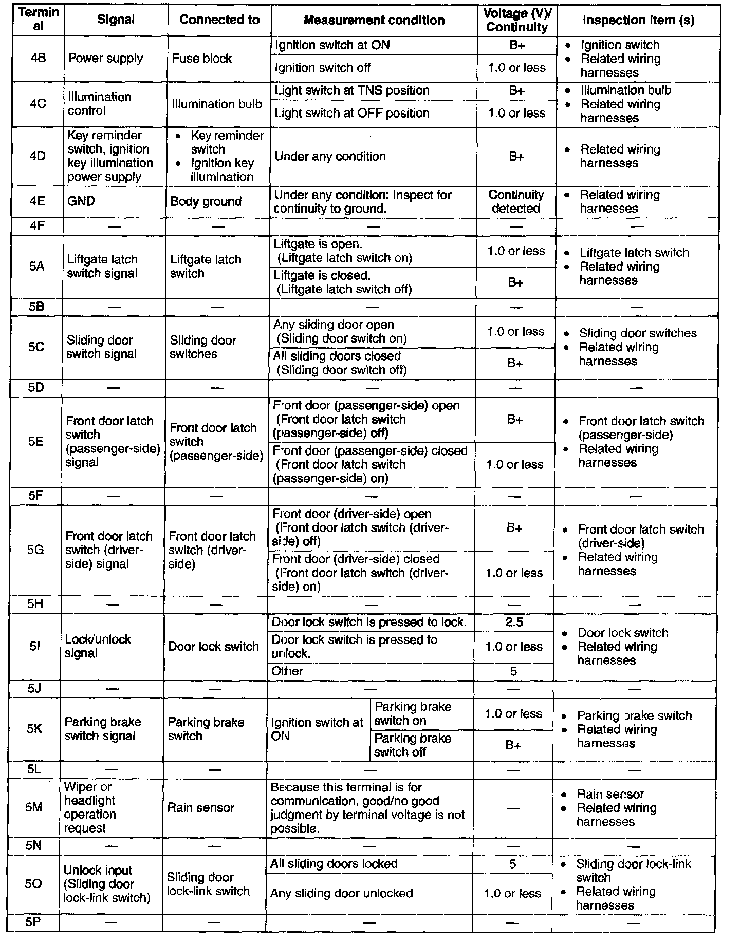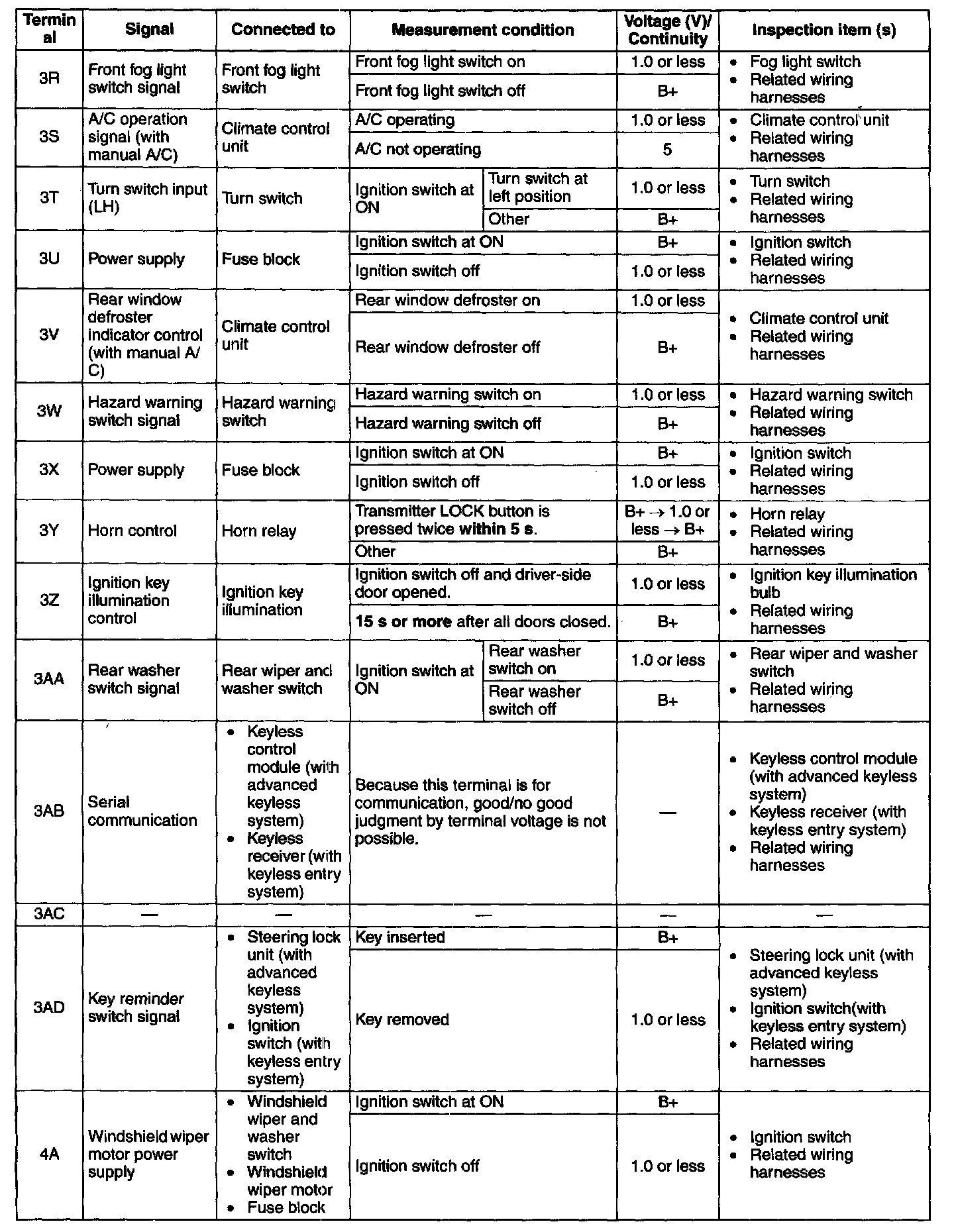 - If the voltage or continuity is not as specified in the Terminal Voltage Table (Reference), inspect the parts under "Inspection item (s)".