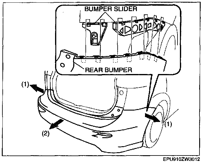 CAUTION: When detaching the rear bumper from the bumper slider, the rear bumper could fall and be damaged. Secure the rear bumper so that it does not fall.