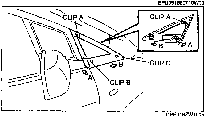4. Remove clips B and C from the vehicle body.