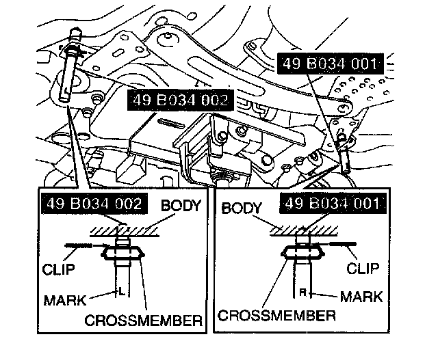 1. Verify the left and right identification marks and install the positioning SST to the front crossmember.