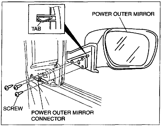 6. Push the power outer mirror against the vehicle and detach the tab while lifting the mirror up to remove.