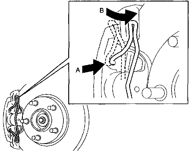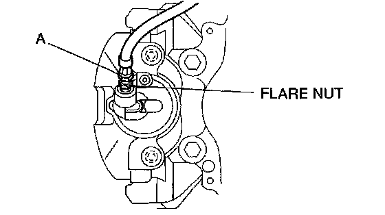 2. Tighten the flare nut while holding the brake hose at point A with a spanner or equivalent.