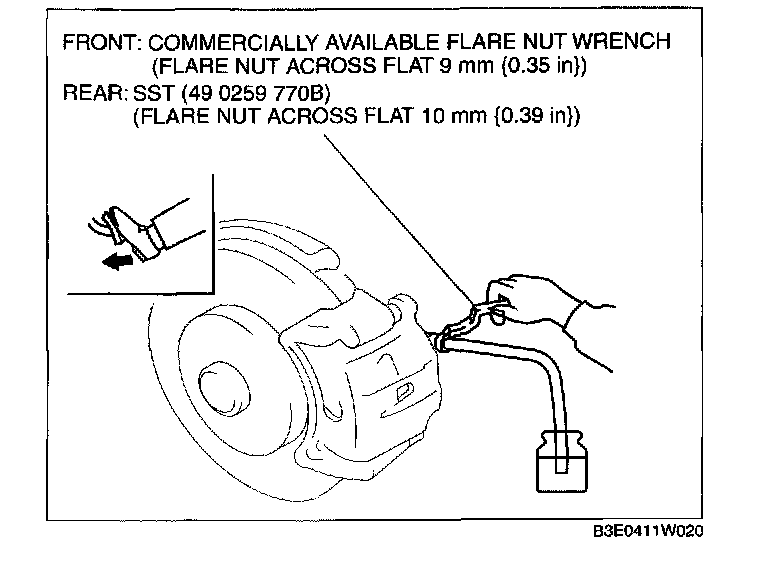 4. While the brake pedal is depressed, the other should loosen the bleeder screw using the SST or any commercially available flare nut wrench, drain out any fluid containing air bubbles, and tighten the bleeder screw.