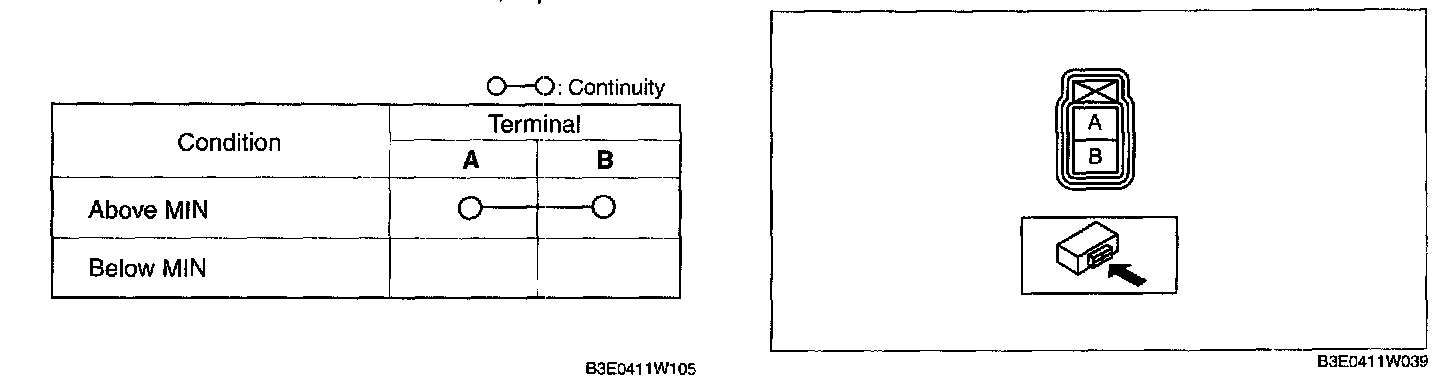 2. Inspect for continuity according to fluid level between the brake fluid level sensor terminals.