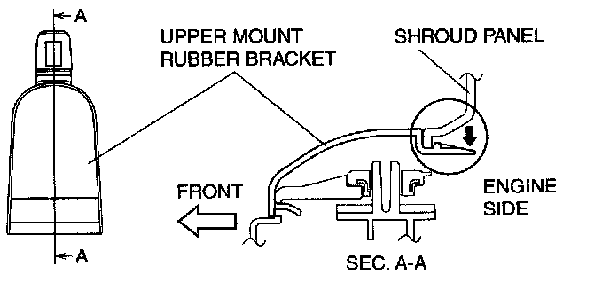1. Remove the upper mount rubber bracket while pressing down the upper mount rubber bracket tab in the direction of the arrow.