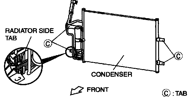 1. Install the condenser to the radiator by aligning lower side tab C with the radiator side tab, install upper tab C, then install lower side tab C.