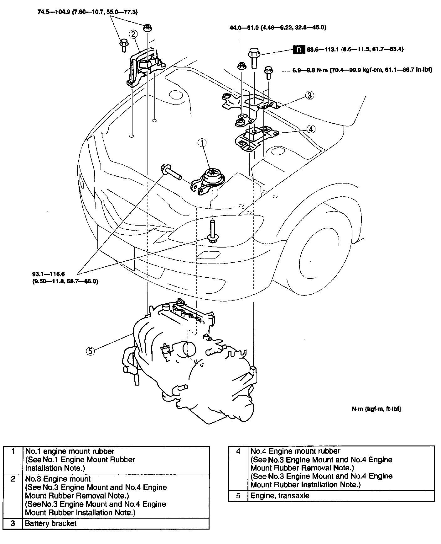 4. Tighten the No.4 engine mount rubber and battery bracket bolts and nuts in the order as shown in the figure.
