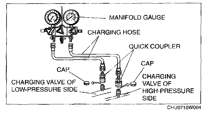 2. Connect the charging hoses to the high- and low- pressure side joints of the manifold gauge.