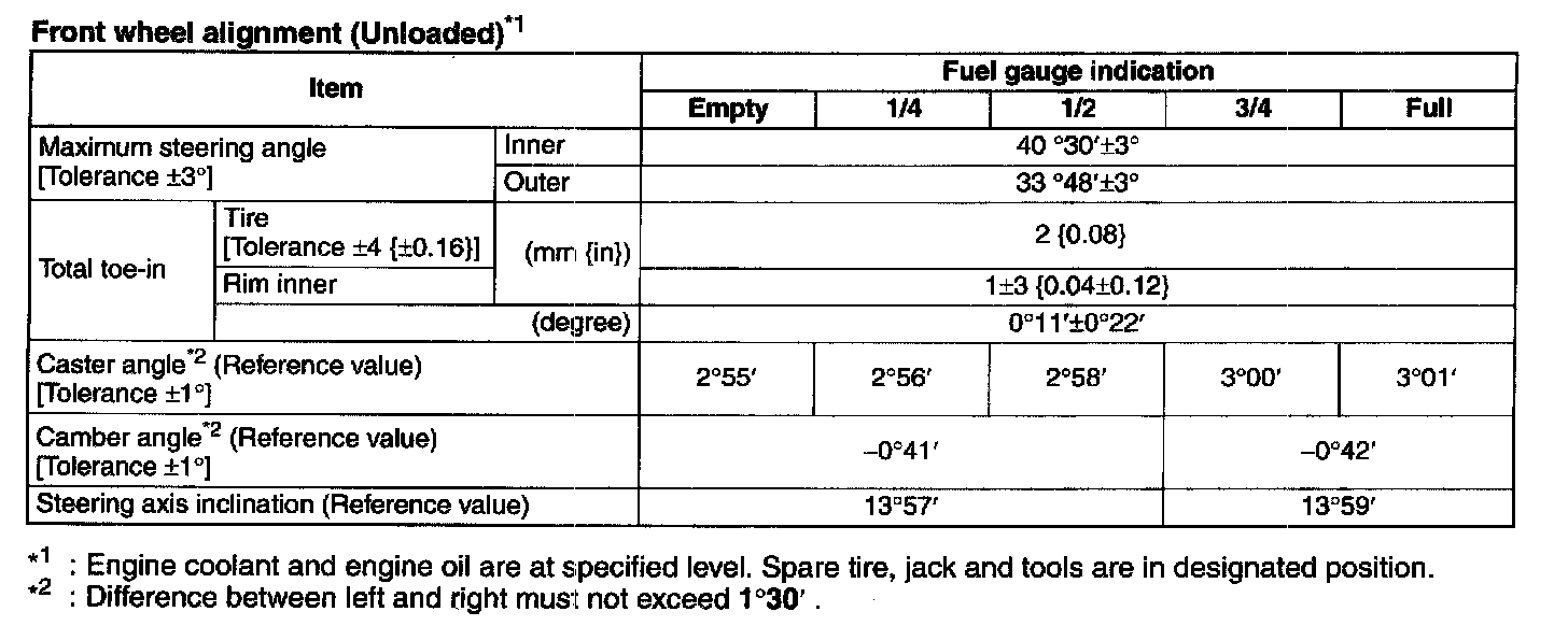 ^ Toe angle changes by approx. 15 mm (0.2 inch) per one rotation of the tie rod for one wheel.