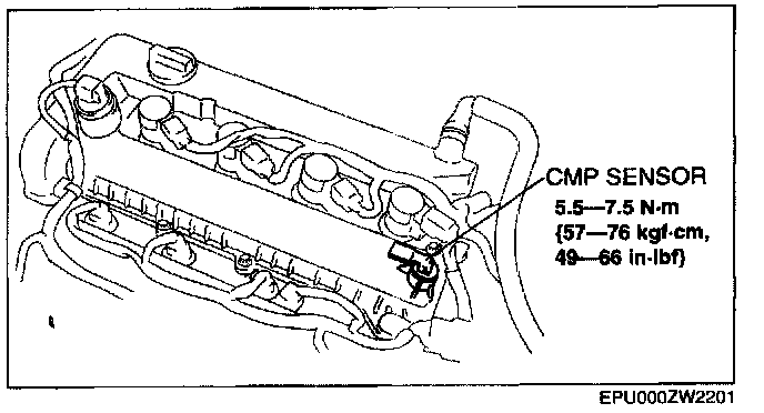 CAUTION: When replacing the CMP sensor, make sure there is no foreign material on it such as metal shavings. If it is installed with foreign material, the sensor output signal will malfunction resulting from fluctuation in magnetic flux and cause a deterioration in engine control.