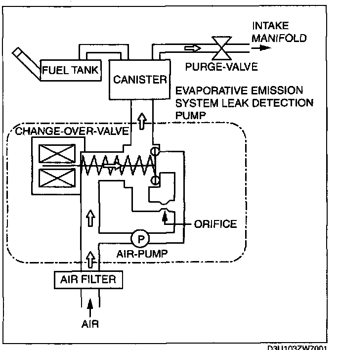 - The EVAP system test finds gas leaks in the system using the PCM to monitor changes in the air pump load current of the EVAP system leak detection pump. This test starts after sending an on-demand test signal from the WDS to the PCM. The PCM controls the air pump and change-over-valve operation and also stores the load current of the air pump as follows: