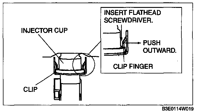 4. Remove the clip from the fuel injector using the following procedure: