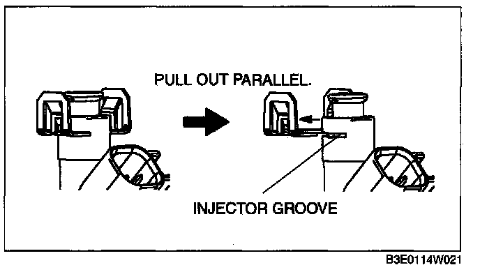 CAUTION: Use of a deformed injector clip will cause the fuel injector to be connected incorrectly and could result in fuel leakage. It will also cause the injector to rotate. Therefore, always replace the clip when the injector is removed.