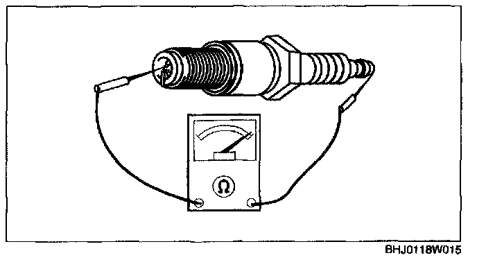 1. Measure the resistance of the spark plug using a tester as shown in the figure.