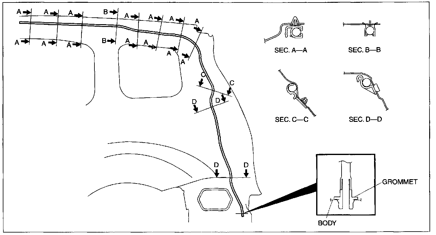 CAUTION: If the rear drain hose is pinched or bent at any point, the water in the hose may not drain and could leak inside the vehicle. During and after installation of the trims and headliner, always make sure there is no interference with the rear drain hose. Correct any abnormality if found.