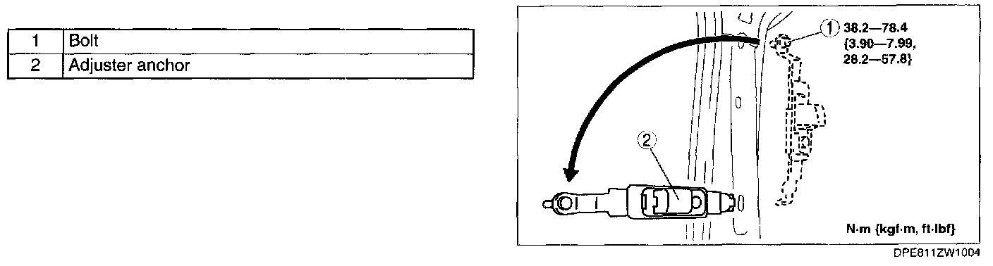 ADJUSTER ANCHOR REMOVAL/INSTALLATIONWARNING: The side air bag sensor is attached to the lower part of the B-pillar.When working around the B-pillar, disconnect the negative battery cable avoiding excessive impact to the lower part of the B-pillar.