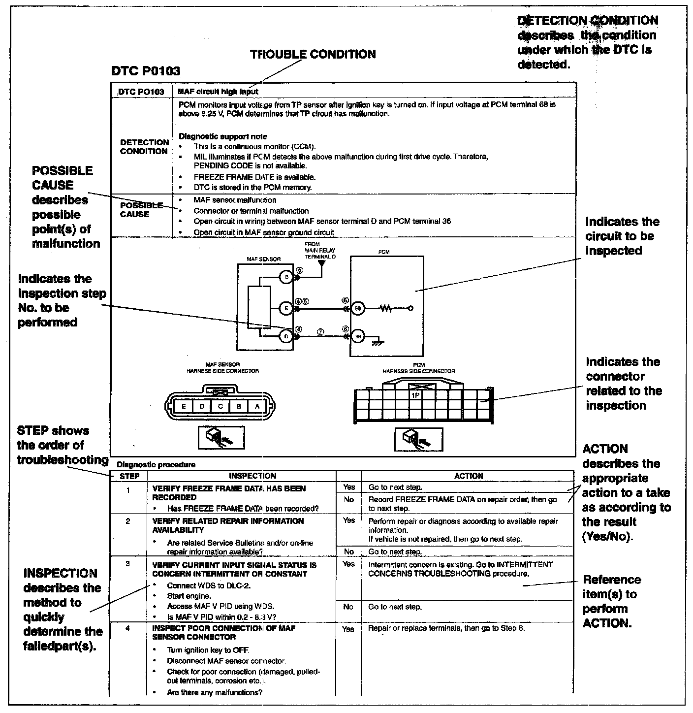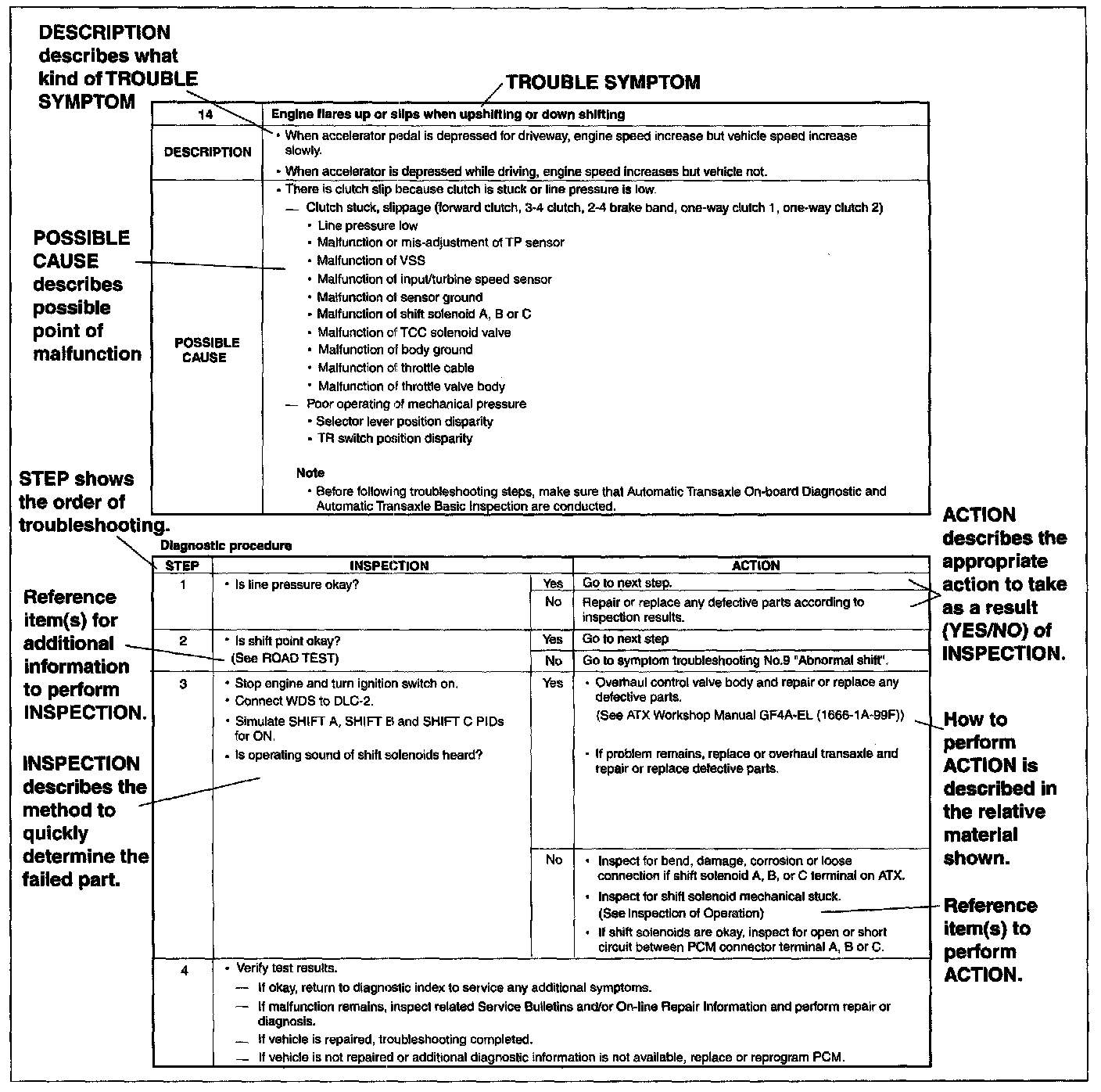 - Symptom troubleshooting shows diagnostic procedures, inspection methods, and proper action to take for each trouble symptom.